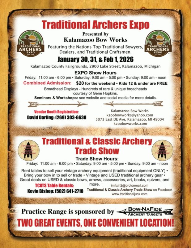 Traditional Archery Expo Date: 01/30/2026 Location: Kalamazoo Expo Center Event Description:Archery Expo at the Kalamazoo Expo Center Dates: January 30th – February 1st Hours: Friday 11am-6pm Saturday 9am-5pm Sunday 9am-Noon